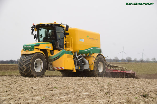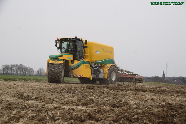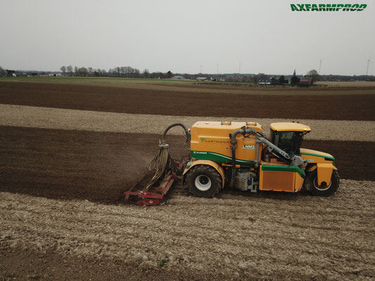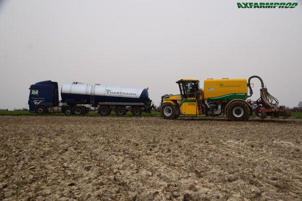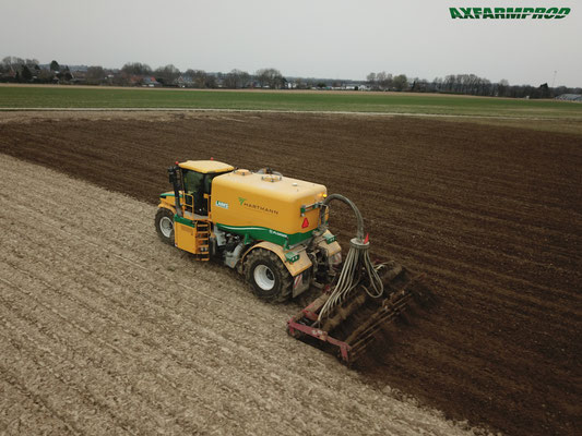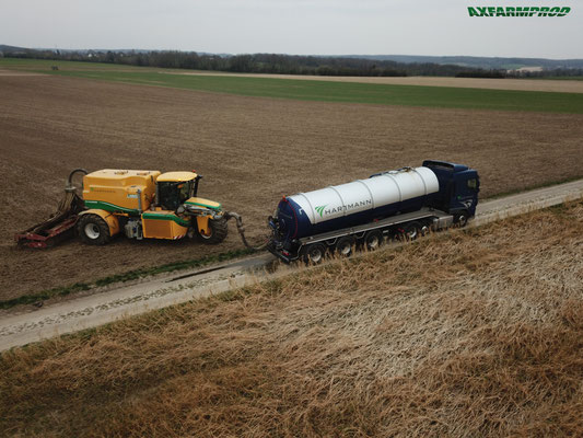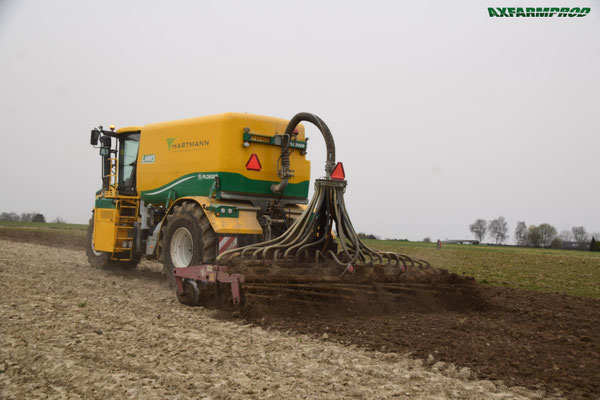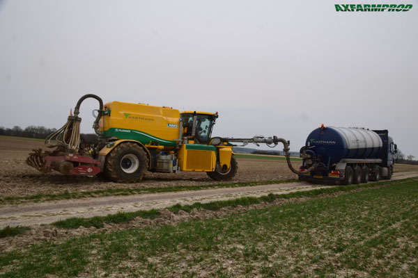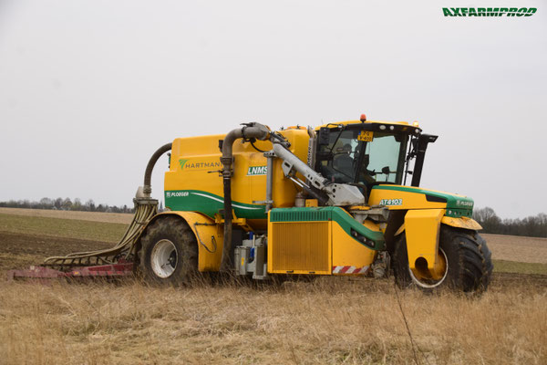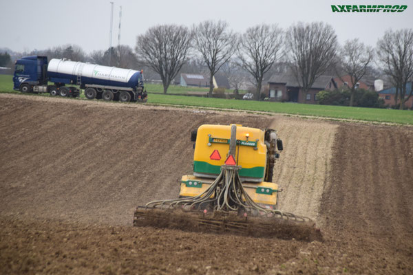 Retour mi-mars avec un injectage de lisier en Hollande par l'entreprise Hartmann avec un Ploeger AT 4103 & injecteur à disques. Plusieurs semis remorques pour l'approvisionner.